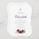 Design består av klassiskt kursivt skript och serif-typografi som är elegant och enkel. Det finns en blombukett med en burgundisk blommigt och en faux guld kor som följer inbjudan.