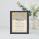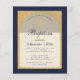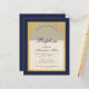 En modern baptisminbjudan. På en marin blå rektangulär bakgrund har den en faux guld-folie som har innanför marin blå text på vit bakgrund. Ord-baptism och namn är skrivna i ett kalligrafiskt skript för elegant. Den första raden är bågtext.