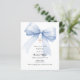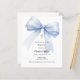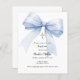 En vit bakgrund, dekorerad med en ljusblå stor båge och en gyllene kor. Anpassa och lägg till namn och detaljer. 1 lakan = 1 inbjudan tryckt kant till kant.