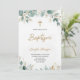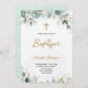 Front of a baptism invitation with elegant typography, featuring a gold cross and green leaves. The tone is serene and celebratory.