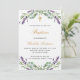 En vit bakgrund som dekoreras med lavender-blommor och eukalyptus grey. Personalisera och en namn och ceremonidetaljer. Svart och guldfärgad färgad brev. Bakåt: Bakgrund för lavender-färgaden.
