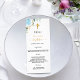 Menykort för baptism. Anpassa och lägg till namn, datum och meny. En vit chic bakgrund. Dekorerad med en vattenfärgad ljusblå ro och grönt eucalyptus löv, sprig, grönsak, faux guld löv. En faux guld kor. Matchande napkins finns i vår butik!