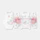 En vit bakgrund. Dekoreras med stora rosa och vita blommigtar. En gyllene kor. Anpassa och lägg till namn, ålder och datum.