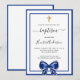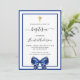 En modern, elegants- och baptisminbjudan. En vit bakgrund som dekoreras med royal blå ramar och båge. Anpassa och lägg till namn och detaljer. Svart färgad brev.