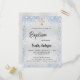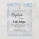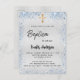 En modern, elegant baptism, som firar ett pojke. Faux silver tittar bakgrund som dekorerats med blå faux glitter-sparkler och en gyllene kor. Anpassa och lägg till information om namn och party. Svart färgad brev.