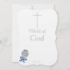 Elegant Baptism Kor Son Bjud in med enkla handmålade silver kor med guld-accenter på framsidan och baksidan av kortet. Färsk och skarp tittar. Baptism och Barnets Namn är skrivet i söt blå skrift. Anpassa till Baby First eller Mitten Första och Namn, Baptismens datum och detaljer. Kortets baksida är vit med texten "Guds underbarn" i silver, med en silver baby-rattbild med blå stjärna och en elegant blå bugg med Kärlek inskriven i striden i vit text. Välj stil och papper typ. Originalgrafik och design efter © 2018 TamiraZDesigns.