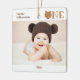 En första födelsedag, en ettårig, baby-fotojulprydnad med en söt björn ansikte som en del av ord "One". Anpassa bara den här prydnaden med namn & foto från baby och året, lägg till den i din vagn och njut av den på Julgran! Bär en första födelsedag Keepsaké Baby Photo Ceramic Ornament Holiday Design | ©Melissa Patton - Designer/Illustrator