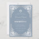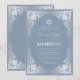 Denna eleganta dammiga blå och silver bar mitzvah-inbjudan med vintage-känsla har en utsirad falsk silverfolierad ram med eleganta barocka silvergrå dekorationer på en dammig blå bakgrund. Ovanför texten finns en davidstjärna i falskt silverfolie. Med undantag för tillfället "Bar Mitzvah", som också är i falskt silver, kan all text anpassas och har en silvergrå färg som liknar den falska silverramen.