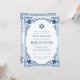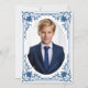 Denna eleganta bar mitzvah-inbjudan med vintagekaraktär har en utsmyckad ram med eleganta barockdekorationer. Ovanför texten finns en davidstjärna. Stjärnan, ramen och texten är klassiskt blå, bakgrunden är vit. På baksidan finns ett ovalt platshållarfoto inuti samma vintage-ram.