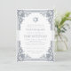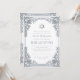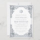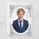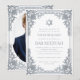 Denna eleganta bar mitzvah-inbjudan med vintagekaraktär har en utsmyckad falsk silverfolierad ram med eleganta barockdekorationer. Ovanför texten finns en davidstjärna, också i falskt silver. All text kan anpassas och har en grå färg som liknar silverramen. Bakgrunden är vit. På baksidan finns ett ovalt platshållarfoto inuti samma vintage-ram.