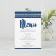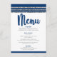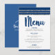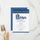 Var stolt, jubla och visa upp denna milstolpe för din favorit Bar Mitzvah med en fest att vara stolt över! Förför dina gäster med denna fantastiska, moderna, festmåltidsmeny, med marinblå kalligrafi-skrift, djärva marinblå och mjuk grå typografi och en marinblå och falskt silver glitterrandig tallit-inspirerad grafik, allt över en enkel, vit bakgrund. Hans namn, evenemangets datum och en vit David-stjärna över en blåklintsblå bakgrund finns på baksidan. Anpassa den anpassade texten med all din meny och annan information. Garanterat att tillföra stilfullt kul till hans speciella tillfälle!