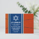 Inbjudningskort för Bar Mitsva-firande med baskettema med orange basketplan som bakgrund och blåa detaljer i form av baskettröjor. Detta inbjudningskort för Bar Mitsva-firande med baskettema är stilrent och modernt. Detta inbjudningskort för Bar Mitsva med baskettema har en orange basketboll som bakgrund med en judisk David-stjärna och blåa detaljer. Färgerna på denna Bar Mitsva-design med baskettema är orange, blå, vit och svart.