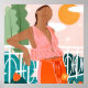 En kvinna lutar sig tillbaka, blöder i det varma solljuset, omgiven av lush grey och blommar. Mjuka pasteller och feta orangar skapar en drömmande, avslappnad sommarvibe. Scenen fångar ett fredligt ögonblick av lugn och ofruktbar skönhet.