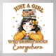 En charmerande illustration med en flicka som lutar sig på en stapel av bokar och en stapel av bokar på huvudet. Den färgstarka texten lyder: "Bara en flicka som för bokar överallt". Den här utformningen är tillgänglig för en mängd olika produkter.