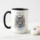 Katt med grått-brindel i katt för utspädd vattenfärg omgiven av rosa och blåa blommor. Baksidan av kaffe mugg har kattpapp med namn inuti.