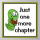 Rolig affisch för bokälskare. Inuti en vit fyrkant med svart och grön ram finns en söt bokmask som bär glasögon och håller en brun bok. Han visar tummen upp och har en stor glad leende. Till höger om masken står orden "Bara en till kapitel" i svart bokstav.