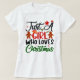 Den här vita t-tröjan innehåller texten "Bara en GIRL WHO KÄRLEK jul" i en festlig design. "GIRL" i ord är i rött med en snöflinga, och "jul" är i grönt skript, adorerad med pepparkaksgubbar, en julhatt, stjärnor och holly. Utformningen är ett enkelt kärlek för julens helgdag.