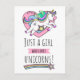 En söt enhörning under flygning pryder denna design, accentuerad med ett rosa hjärta, stjärnfall och en slogan som lyder "Bara en tjej som älskar enhörningar!"