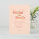 En bröllopsinbjudan med typografi för återsändande av orange är en snyggt och ett unikt val för ett särskilt tillfälle. Den djärva, ljusa orangen brev står ut mot den ljuspersikobakgrunden och skapar en slående visuell kontrast. Inbjudan förbättras ytterligare genom att man lägger till sol och blommans designdetaljer, vilket ger en aning av stollig och spelbarhet till den övergripande designen. Sol och blommor tillför inbjudan en munter och glad vibb, skapar den perfekt för en roligt och ett minnesvärt bröllop firande.