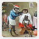 En apbarber klädd i en blå skjorta och röd hatt med vit plumm, glasögon på bron över näsan, som klipper whisky från en tittar katt. I bakgrunden tittar en grupp av chatterande apor på. Kammar, saxar, salvor och flaskor av blandningar av färgad är spridda över hela området. Kvickolja på koppar av flamländsk målare, Ferdinand van Kessel.