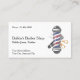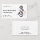 A custom business card showing an iconic illustration of a barber pole with a razor and a pair of scissors. This design is for a barber or someone who owns and barber shop. Easy to edit with your information. Background is white.