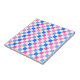 A checkerboard pattern of pink, blue, and white squares creates a vibrant and lively visual effect, conveying playfulness and energy.