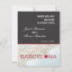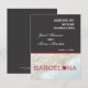 Elegant och modern spara datum-kort. Perfekt för en destination bröllop baserad i Barcelona, Spanien. Har en karta över Barcelona med Medelhavet. Stadens namn har ett hjärta inuti bokstaven "O". Sofistikerad design perfekt för ett globalt och trendigt par. Lägg till din egen formulering eller beställ det som visas.