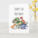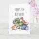 I den här snygga vattenfärgsdesignen ingår vattenfärgsdinosaurier i olika nyanser av rött, blått och grönt. Denna utformning av dinosauriefödelsedagskort innehåller också frasen "Grattis på födelsedagen!" på kortets framsida. Insidan av kortet innehåller en ställe som lägger till ett namn samt frasen "Hoppas att din födelsedag är T-riffic!"