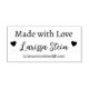 Ord "Made with Kärlek", för att anpassa dina speciella produkter med kärlek... ditt eget namn eller varumärke i ett elegant med ett typsnitt av typsnittet stil och en rad för att lägga till e-post eller annan ytterligare information om ditt företag.. två små kärlek-hjärtan på båda sidor.