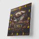 Ett vackert kardad träskylt med häst, hytt och berg, personlig med namn Emily, mot en strålande bakgrund.