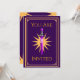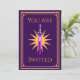 Magisk lila svärd födelsedagsinbjudan perfekt för en 5-årig hjälte. Idealisk för fantasy warrior-tema fester och episka barnfiranden. Redigerbar text för namn, datum och festdetaljer.