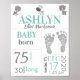 Födelsestatistikskylten med tre djur från djurparken (ren, zebra, noshörning) och ett fotavtryck från bebisen. Denna könsneutrala skylt har all information om födseln, inklusive datum, födelsetid, vikt och födelseort. Det finns till och med en plats där du kan lägga till ett fotavtryck.