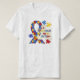 Ett pusselbiet, som läser 'mig, älskar ett barn med Autism", pusseldelar av blått, rött, och gult och autismmedvetenhetbandet på autismmedvetenhetT-tröja, hoodies, muggar, magneter, kort, klistermärkear, hänger lös, keychains, knäppas, och andra objekt.