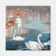 I vintage bild finns det en grupp barn som matar vackert vitt svanar vid kant i sjö i en skog. Bilden är blå, orangar och vit. Se min butikskonst efter MAR för matchning av produkter med den här designen.