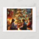 Tre barn i den festliga pyjamas sitter runt ett Julgran som tänds med en ljus belysning, med presenter under och med strumpor som hänger ihop med eldstaden. Den mjuka glöden av ljus skapar en varm och mysigt atmosfär i rummet.