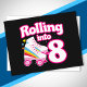 Denna skridskofestdesign är perfekt för en rullskridskofest eller födelsedagstema för en 8-åring. Om födelsedagsflickan eller födelsedags pojken älskar att rullskridsko, kommer de att ÄLSKA denna skridskofestdesign! Funktioner retro stil "Rullar in i 8" födelsedagsfras med cool rullskridsko grafik med regnbågar & stjärnor som är roligt & unikt. Rolig rullskridsko festdesign för en 8-årsdag!