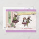 Tre barn har lämnat en hög med leksaker och ett litet Julgran vid en ytterdörr och den äldre flickan ringer klockan i detta årsvanskort från 1912.