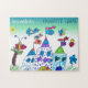 Cute, förskolan barn-slott omgivet av blå himmel, fåglar, sol och kryp. Trendig, färglöst, favoritpussel med eget namn.