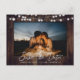 Rustik bröllopsfoto spara datum vykort med en trä fotorahm prydd med strängljus. Idealiskt kortdesign för en rustic-themed bröllopsfest. Lätt att anpassa med ditt foto och bröllopsdetaljer.