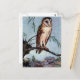 En lada uggla med en späckad tumörplats på ett gren som förbiser ett bondhus, hökar och en rosa lada i en vintage illustration från en fågel bok 1922.