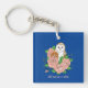 En lada uggla med ett halvmåne måne på förhuvet är bland rosa blommor i en mörk blått bakgrund.