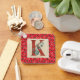 Snyggtens nyckelkedja för hennes ljusa träbakgrund med linnröd träfylld Brev K accentuerad av en vattenfärgsstjälk av eukalyptus löv och en roligt röd paisley bandana skriver ut gräns.