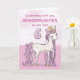 En söt rosa ponny precis som ditt barnbarn skuttar omkring med siffran sex! Guldliknande detaljer är invävda i hennes man och svans. Perfekt kort för att önska ditt barnbarn på 6-årsdagen!