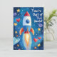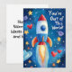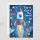 Det här lekfulla hjärt-dag-kortet är designat för att fånga rymdens under på ett roligt och livfullt sätt. Framsidan på det 5"x7" stora kortet visar en färgrik raket som skjuter iväg in i en stjärnfylld blå galax, omgiven av skinande gyllene stjärnor, fantasifulla planeter och fladdrande röda hjärtan. Det glada budskapet "Du är fantastisk!" tar mittplatsen och bidrar till kortets kosmiska charm.