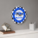 Originalgrafik - sovvagnar tävla blå väggklocka för pojkar. Perfekt för ett sovrum med blå tävla. En blå sportbil på flagga som kontrolleras med bilder. Anpassa med namn och nummer eller ålder efter eget val. För närvarande står Alistair 07. Grafiskt designat av Sarah Trett.