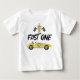 Pojkar som tävlar i födelsedagspresent till 1-årsdag t-shirt med gul akvarell racerbil, rutor flaggor, en trofé, och texten "SNABB ETTE".