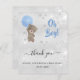En faux silver metallisk tittar bakgrund. En nalle med blå ballongstjärnor och faux glitter damm. Anpassa och lägg till namn och ett datum på framsidan. Namn och texten: Oh Boy! är skrivna med ett handskript stil Tillbaka: Tackkort och namn