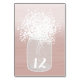 Ett bordsnummer i bröllop med ett Mason burk av baby utandningsillustration över en vattenfärgsinspirerad bakgrund.