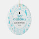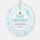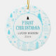 Barnets första jul grannstensdekoration design. Julgran, grönska, snöflinga babyblått mönster med utrymme för barnets namn, år och ditt favoritfoto på baksidan.