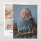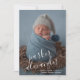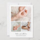 Elegant söt vertikal födelseannons med ditt favorit nyfödda foto i full bleed, med barnets namn i snedställd vit skrift och födelseuppgifterna på framsidan med 3 bilder och era namn på baksidan. MATCHANDE artiklar i vår butik.